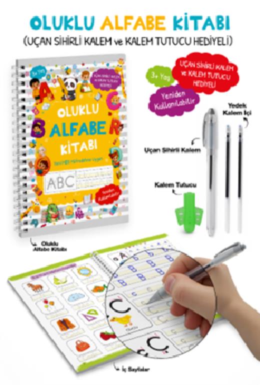 Oluklu Alfabe Kitabı Uçan Sihirli Kalem ve Kalem Tutucu Hediyeli 3+ Yaş